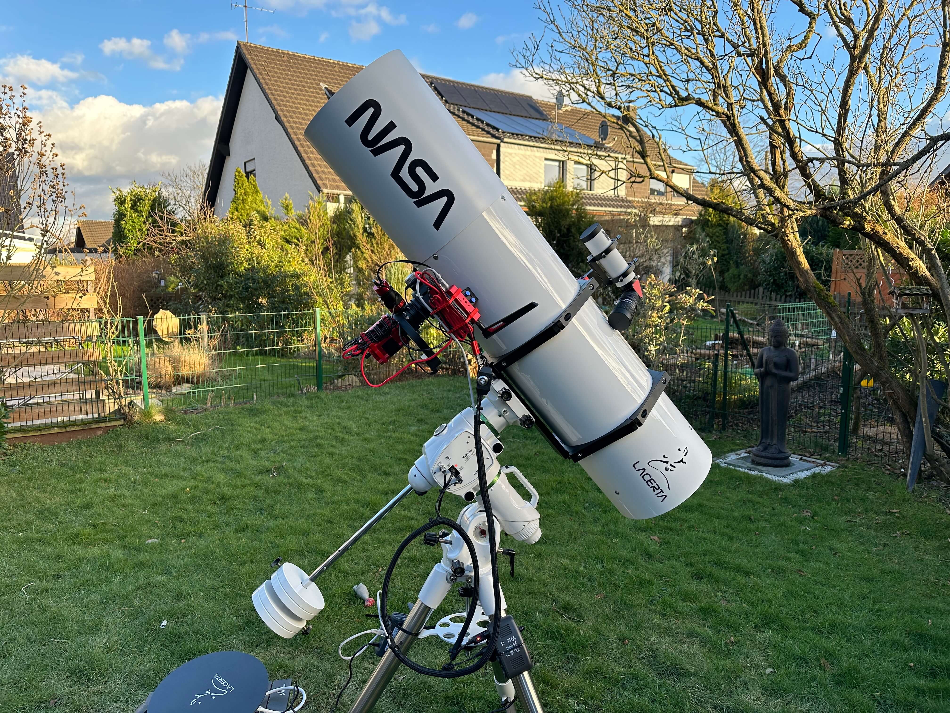 Wenn man sich eine Weile mit der Astrofotografie beschäftigt kommt man irgendwann an den Punkt, wo man sein Teleskop nachjustieren - kolimieren muss. Spätestens jetzt merkt man, warum ein Skywatcher Teleskop so günstig ist. Besonders der Fangspiegel ist eine sehr billige Ausführung und nur schwer sauber einstellbar. Und selbst wenn es gelingt… hält es nicht lange. Also musste was besseres her. Klar, ich hätte den Quattro optimieren können. Aber das bringt auch nicht wirklich was. Daher habe ich mich nach einem neuen Teleskop umgeschaut. Es wurde ein Lacerta Photonewton mit einem 250mm Spiegel und 1000mm Brennweite. Jedes Teil an diesem Newton ist von höchster Qualität. Selbst nach der Versand via Spedition von Wien nach Köln, war das Teil immer noch sauber justiert!