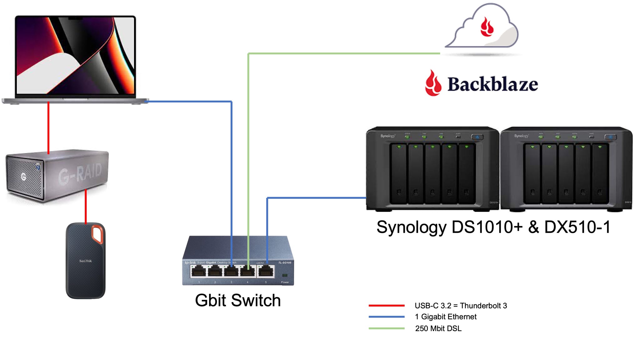 Wer seine Daten in Sicherheit wissen will, muss schon etwas dafür tun. Ob es nun gleich ein 10Gbit Netzwerk sein muss oder ein RAID aus SSDs, hängt vom Einzelfall ab. Wer große 4k Videodateien in Echtzeit bearbeiten muss und da auch intensives color grading macht, wird um eine SSD als Arbeitsplatte nicht herumkommen. Am besten noch intern in einem m1 Mac der neuesten Generation. Die Lösung, welche ich mir gebaut habe, versucht einen einfachen Workflow mit maximaler Sicherheit zum sinnvollen Preis zu kombinieren.