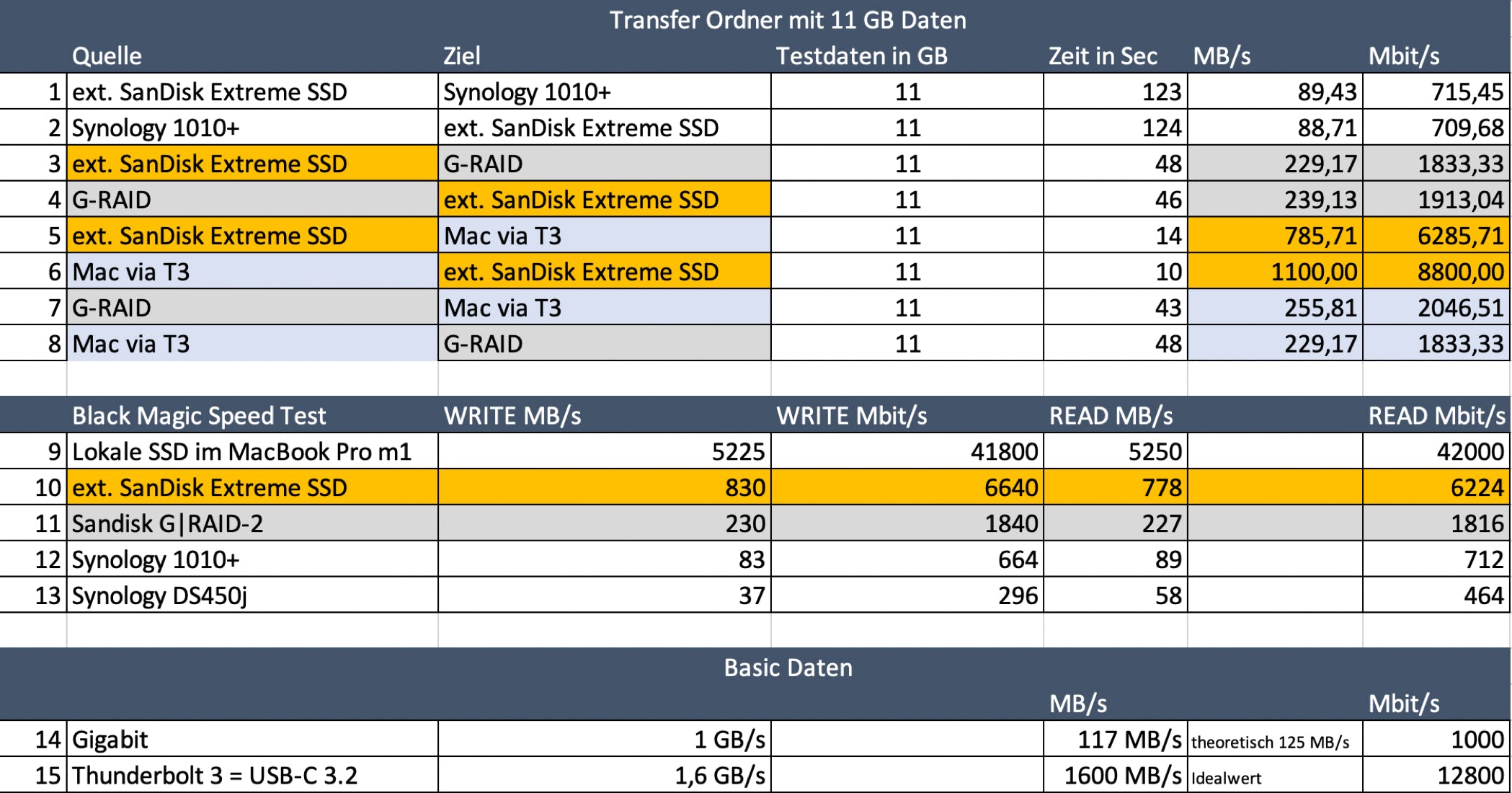 Schauen wir uns Zeile 7 und 8 an. Das G-RAID hängt via Thunderbolt 3 am Mac. Die Bandbreite (Zeile 15) ist hier gigantisch. Die externe SSD hat ebenfalls genug Leistung. Die Grenze ist das G-Raid. Mit Rund 250 MB/s ist der erreichte Wert weit über der Leistungsfähigkeit eines 1 Gigabit Netzwerkes, aber hier bremsen die klassischen, drehenden Festplatten aus. Schauen wir uns den Unterschied in den Datendurchsatzwerten an, so stehen rund 2.000 Mbit/s mit dem G-RAID (Zeile 7 & 8) gegen rund 7.000 Mbit/s von einer externen SSD (Zeile 5 & 6 gegenüber. Das ist rund das 3-Fache an Leistung!